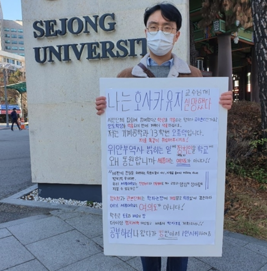 세종대 교문 앞에서 일인시위하는 오종택 / 인터넷