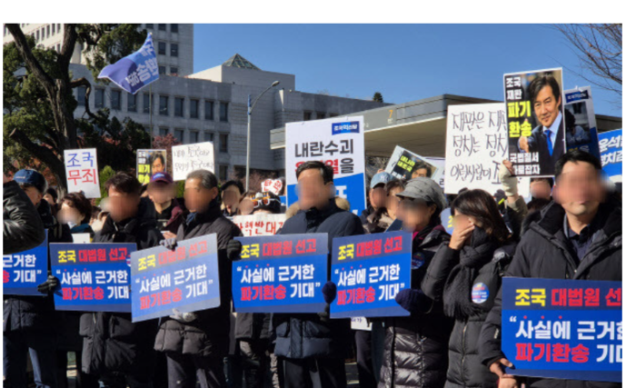 12일 서울 서초구 대법원 인근에서 조국 조국혁신당 대표에 대한 실형이 확정되자 지지자들이 “우리가 조국이다”를 외치고 있다. 연합뉴스