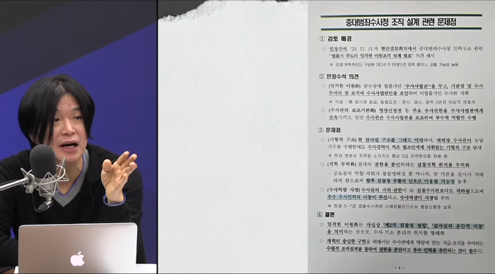 1월 9일 방송된 김어준의 겸손은 힘들다 뉴스공장 ‘주기자 라이브’에서 주진우 기자가 ‘중대범죄수사청 조직 설계 관련 문제점’이라는 제목의 문건 1장을 전격 공개했다.