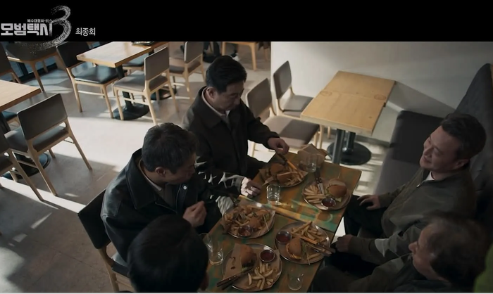 오원상(김종수 분)이 ‘모범택시3’에서 계엄을 모의하기 위해 햄버거집에서 부하들과 회동하는 장면(SBS)