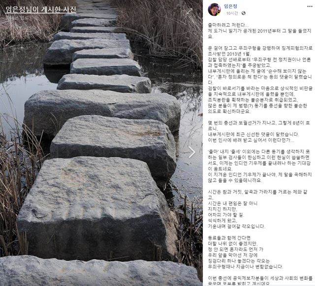 앞서 임 부장검사는 2017년 12월 내부고발자들에게 주는 ‘이문옥 밝은 사회상’을 수상했다. 그는 당시 수상 소감을 인용하며 “검찰 안팎으로부터 조직에 칼을 꽂았다거나 혼자 튀려고 저런다는 등의 비난을 들을 때, 역사 속으로 들어가 그런 비난 속에서도 꿋꿋하게 양심을 지킨 분들을 찾아 위로를 받곤 했다”라고 말했다.