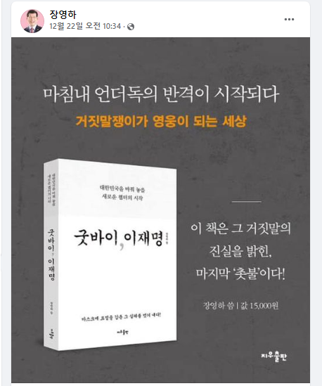 ![]() ▲ 장영하 변호사가 지난 2022년 12월22일 자신의 페이스북에 올린 저서 '굿바이 이재명' 홍보글 © 장영하 변호사 페이스북 |