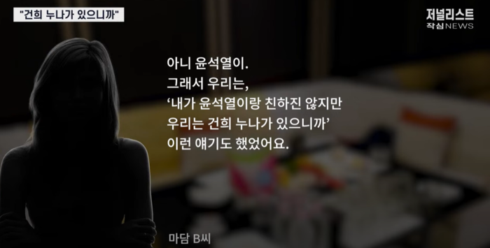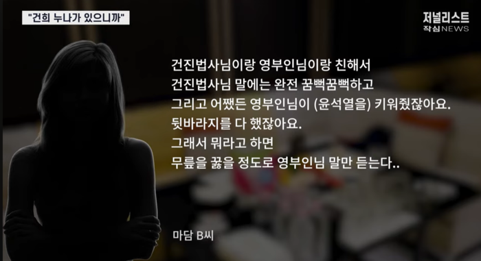 B 씨는 이런 ‘찰리’의 힘이 김건희로부터 나왔다고 주장했다. 그는 ‘김건희가 자신과 친한 건진법사의 말을 잘 듣고 윤석열은 무릎을 꿇을 정도로 김건희 말만 듣는다’라면서 ‘내가 윤석열이랑 친하진 않지만 우리는 건희 누나가 있으니까’라고 ‘찰리’가 말했다고 전했다.